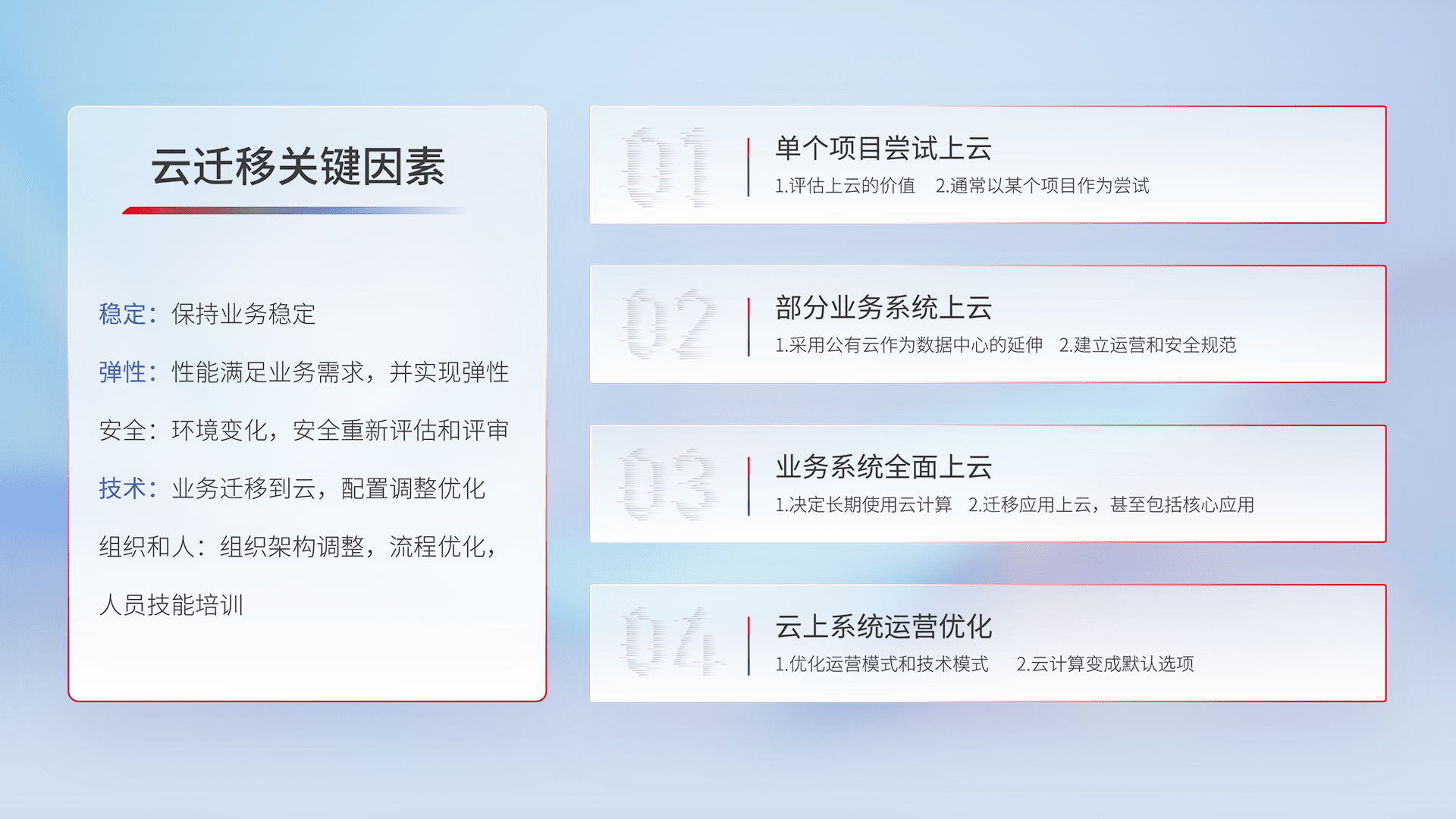结合实际业务,,,从规划设计、、、、云平台选型、、、云原生改造、、、、数据迁移、、、集成交付,,,迁移全过程为客户识别最佳上云路径,,做好风险识别管理,,设计网络架构、、身份权限、、、安全审计合规、、操作审计、、日志审计、、监控告警策略、、、多站点容灾设计等,,对云上基础设施进行整体规划,,,提升IT治理水平,,以满足弹性、、高可用、、、、高性能的需求。。