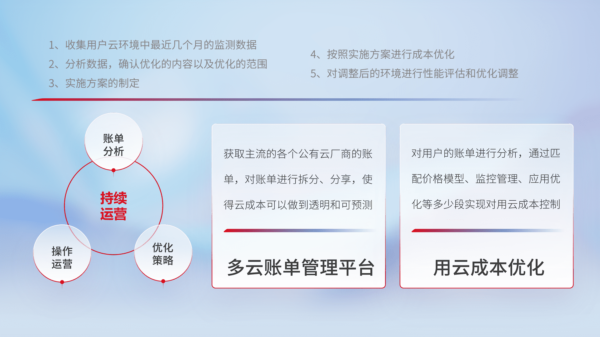 通过多云纳管,,,以统一的资源数据模型把客户的云资源进行抽象和封装,,进而实现对多云资源的统一操作,,,保障云资源管理的可靠性、、、稳定性与可用性。。。。量身定制化运维内容,,,,配置、、、开发运维、、、补丁管理、、备份、、、监控、、认证和访问管理、、审计和日常巡检等,,,保障在用云过程中的可靠度,,,稳定度以及高可用率。。