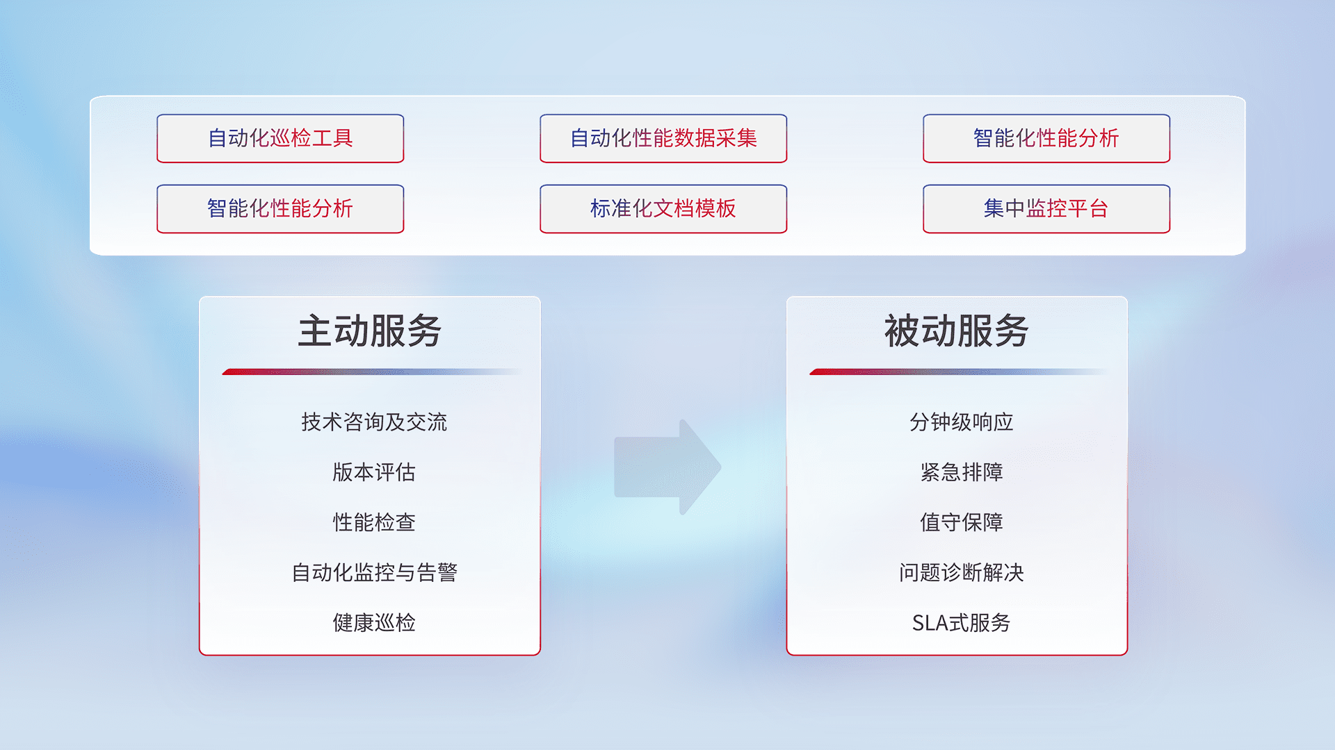 智能化工具和标准化文档,,,,保障服务质量,,提供主动服务(包含技术咨询、、版本评估、、性能检查、、自动化监控与告警、、健康巡检)和被动服务包含(分钟级响应、、紧急排障、、、值守保障、、、问题诊断解决、、、、SLA服务)。。。